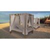 La Cama Balinesa Madera Capri para hogar y para hoteles viene equipada con un colchón de 150x200x10 cm, de 25kilos/m3 de densidad. Tejido mixto en su colchón, parte superior en tejido Náutico y y parte inferior en Textilene. El tejido del colchón se puede solicitar en diferentes colores. Esta Cama Balinesa se acompaña también de 8 cortinas de loneta con botones de madera y ojales, más un techo en loneta con sus cintas de sujeción. Esta Cama Balinesa es además, reclinable individualmente en cada lado.