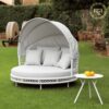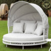 La Cama Balinesa Redonda Romeo es un mueble diseñado y fabricado con materiales resistentes al exterior, de alta calidad y detalles muy bien acabados. Hablamos de una Cama Balinesa de diseño circular, para jardín, con estructura muy resistente de aluminio, recubierto de resistente cuerda y colchoneta de tejido acrílico impermeable. La Cama Balinesa viene acompañada de los cojines que se ven en las imágenes. El techo de este artículo es una capota movible. Este mobiliario es perfecto para soportar las condiciones de la intemperie, y se comporta muy bien ante el paso del tiempo. Se pueden elegir diferentes colores para el textil, si interesa, consultar.