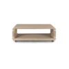 La mesa de centro Hawai se presenta en un kit de sencillo montaje. Su material es Madera DM texturada, en color cambrian. Tiene detalles el ambos laterales en color blanco laca piano. La mesa cuenta con ruedas con freno para su fácil transporte.